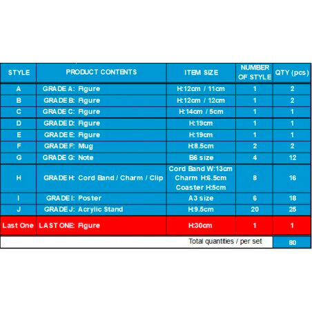 Lotería japonesa con productos de Dragon Ball!. Contiene 80 productos y sus correspondientes 80 tickets sorpresa para canjearlos por los premios obtenidos. Además el ultimo ticket tiene un premio extra añadido al premio de la letra que salga. Esto hará que cuando empiecen a quedar pocos tickets, vuestros clientes compren todos los tickets restantes para poder llevarse el premio especial. Esta figura no se podrá conseguir de ninguna otra forma.
