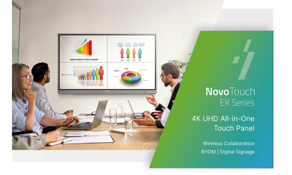 Las pantallas cuentan con funcionalidades de colaboración inalámbrica NovoConnect, videoconferencia, BYOM (opcional) y señalización digital NovoDS